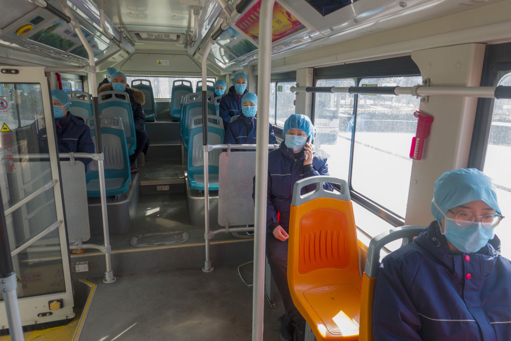 青島大學(xué)附屬醫(yī)院醫(yī)療隊醫(yī)護(hù)人員下班后乘大巴返回駐地,分散坐車,減少交叉感染風(fēng)險。