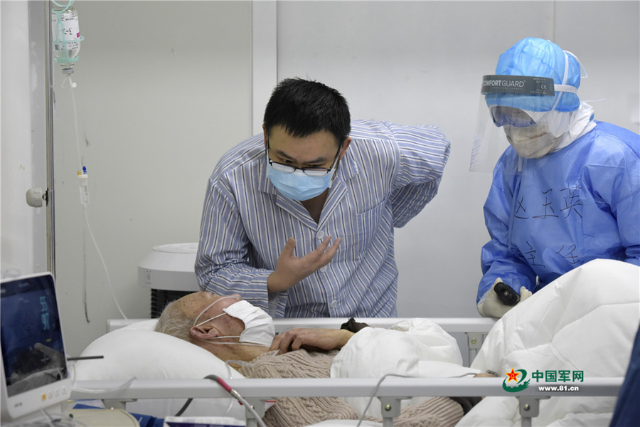 在病房,萬先生當(dāng)“翻譯”,幫助醫(yī)護(hù)人員和只會(huì)講方言的老年患者交流。中國(guó)軍網(wǎng)記者范顯海 攝