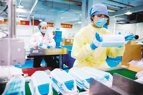 2月14日,浙江省長興縣和平鎮(zhèn)長興美迪康無紡布制品有限公司員工加緊生產(chǎn)口罩。 許 旭攝(中經(jīng)視覺)
