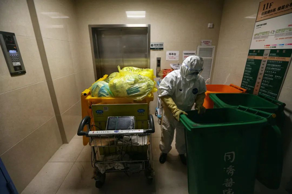 早上六點(diǎn),武漢同濟(jì)醫(yī)院中法新城院區(qū)的工作人員開(kāi)始上崗,清理住院樓內(nèi)的醫(yī)療廢物。(攝影:崔萌)