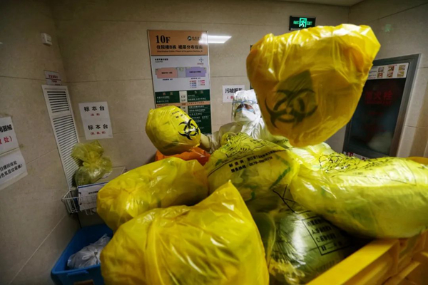 同濟(jì)中法新城醫(yī)院的醫(yī)療廢棄物原本放在醫(yī)院地下室的暫存間,使用紅外線和藥水進(jìn)行消毒,但是隨著新冠肺炎疫情的到來(lái),產(chǎn)生的醫(yī)療廢棄物是以前的近十倍,而且都是感染性的醫(yī)療廢棄物?!耙郧拔覀兊尼t(yī)療廢棄物放在垃圾桶里都會(huì)把垃圾桶蓋子蓋上,但是現(xiàn)在醫(yī)療廢棄物實(shí)在太多了,不僅蓋子蓋不上,我們還要把垃圾硬塞進(jìn)垃圾箱,有時(shí)候裝有醫(yī)療廢棄物的垃圾袋受擠壓會(huì)突然炸開(kāi),嚴(yán)重威脅我們醫(yī)療廢物處理人員的安全,但是為了盡快收完垃圾,確保院區(qū)所有人的安全,我們只能不惜一切代價(jià)了?!?另一位負(fù)責(zé)醫(yī)療廢棄物的處理工作的周師傅稱。