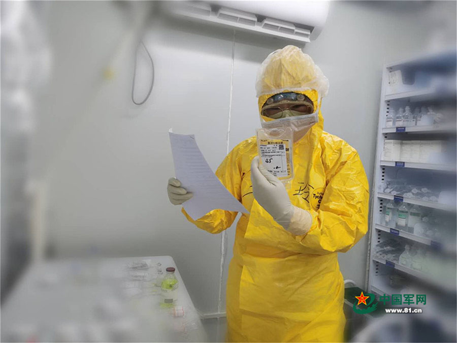 今天的主要任務(wù)是給18名病人抽血。這項(xiàng)平時(shí)對(duì)我來說簡(jiǎn)單的不能再簡(jiǎn)單的任務(wù),此刻卻充滿了挑戰(zhàn)性??谡?、帽子、手套、防護(hù)服、護(hù)目鏡、防護(hù)面屏都給抽血帶來了極大的困難,呼出的熱氣讓護(hù)目鏡變得模糊,昏暗的燈光讓本就有限的視線變得更加不足,三層防護(hù)手套讓抽血也變得毫無手感。在抽血過程中,一個(gè)大媽問道:“姑娘,你們是來自部隊(duì)的么?”我看著她那親切的眼神,笑著點(diǎn)了點(diǎn)頭。大媽露出了信任的微笑,“有你們?cè)?,我就放心了?!边@句話讓我的內(nèi)心久久不能平靜。