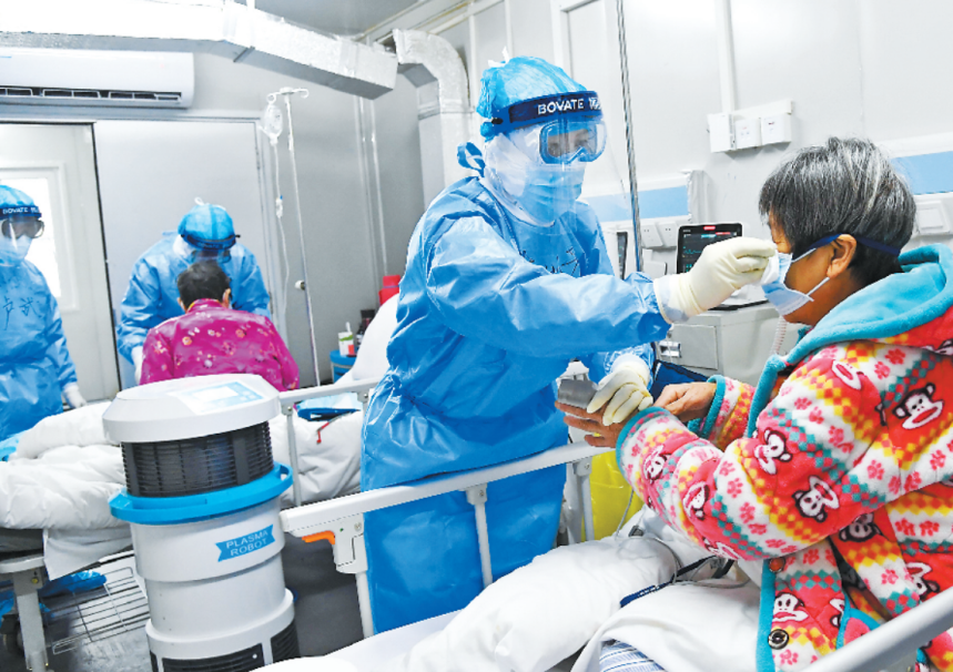 火神山醫(yī)院重癥醫(yī)學(xué)一科自2月10日開始收治重癥患者以來,全科醫(yī)護人員不畏風(fēng)險全力救治,他們根據(jù)患者病情的變化,有預(yù)見性地快速調(diào)整救治方案,采取呼吸支持、抗病毒、維護臟器功能、加強營養(yǎng)等方法,使重癥患者逐漸有了好轉(zhuǎn),提高了救治成功率?;ハ喙膭铧c贊,是在重癥室看到最多的場景。解放軍報記者王傳順 攝