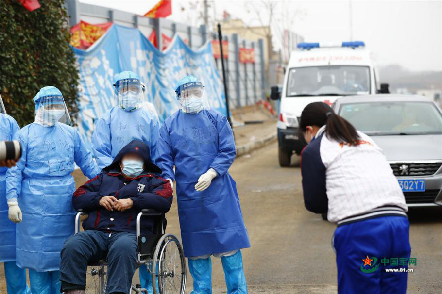 2月27日中午時分,從火神山醫(yī)院傳出好消息,經(jīng)過醫(yī)護人員20多天的科學(xué)救治和精心護理,又有76名新冠肺炎確診患者康復(fù)走出火神山醫(yī)院,是目前該院單日出院人數(shù)最多的一天。圖為患者家屬向醫(yī)護人員致敬。王皓宇 攝