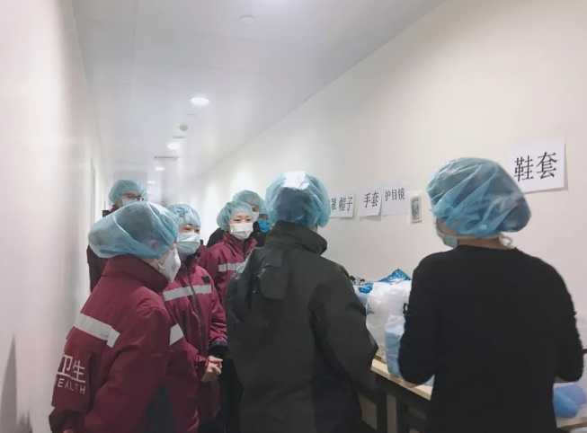 到了武漢大學(xué)人民醫(yī)院,我們在清潔區(qū)的通道里換防護(hù)服,洗手衣+防護(hù)服+隔離衣+自己的衣服,一共四層。再戴上兩個口罩和一個護(hù)目鏡。
