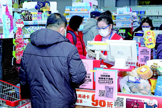 春節(jié)以來(lái),超市客流量增加,物美超市北京石景山區(qū)太陽(yáng)島門(mén)店收銀員葉宗萍一直在門(mén)店堅(jiān)守,從春節(jié)至今沒(méi)歇一天。采訪(fǎng)對(duì)象供圖