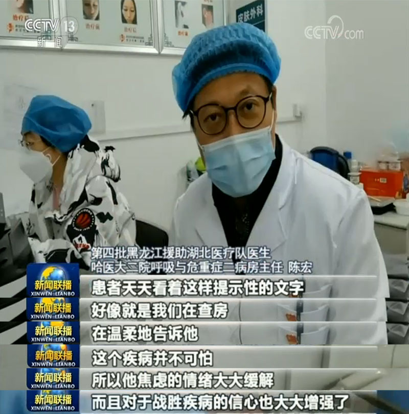 “繼續(xù)努力,早日出院”“新冠必?cái)?,您必勝”“?jiān)持就是勝利”,在武漢市第一醫(yī)院16樓重癥病區(qū),幾乎每位患者床頭都貼有一張寫著鼓勵(lì)話語(yǔ)的淡粉色紙卡,而這些都出自前來(lái)支援的哈爾濱醫(yī)科大學(xué)附屬第二醫(yī)院呼吸科陳宏醫(yī)生之手。