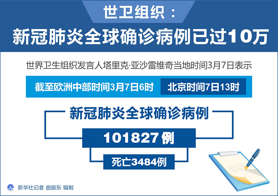 新華社日內(nèi)瓦3月7日電(記者劉曲 陳俊俠)世界衛(wèi)生組織發(fā)言人塔里克·亞沙雷維奇7日對新華社記者說,新冠肺炎全球確診病例數(shù)已突破10萬。
