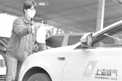 上海燃?xì)鈾z修人員對(duì)待命中的出勤車輛進(jìn)行消毒。(企業(yè)供圖)
