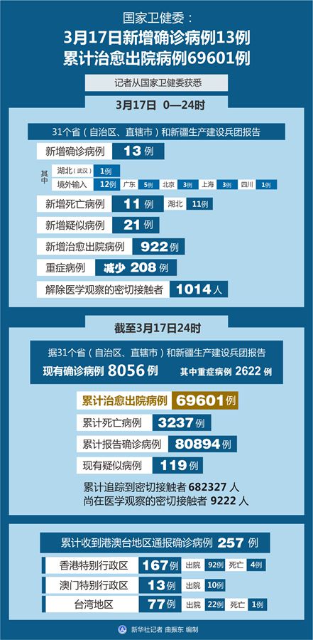 截至3月17日24時,據(jù)31個?。ㄗ灾螀^(qū)、直轄市)和新疆生產(chǎn)建設(shè)兵團報告,現(xiàn)有確診病例8056例(其中重癥病例2622例),累計治愈出院病例69601例,累計死亡病例3237例,累計報告確診病例80894例,現(xiàn)有疑似病例119例。累計追蹤到密切接觸者682327人,尚在醫(yī)學觀察的密切接觸者9222人。