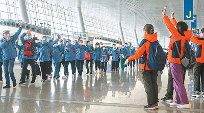 3月17日,在武漢天河機(jī)場,山東國家緊急醫(yī)學(xué)救援隊(duì)隊(duì)員(左側(cè))向江蘇國家緊急醫(yī)學(xué)救援隊(duì)隊(duì)員揮手致意。新華社記者 熊琦攝