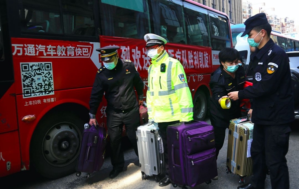 一大早,武昌區(qū)交通大隊(duì)副大隊(duì)長(zhǎng)熊志軍帶領(lǐng)戰(zhàn)友趕到青海援鄂醫(yī)療隊(duì)駐地。送醫(yī)療隊(duì)到機(jī)場(chǎng)的有5輛大巴車,由于駐地酒店入口較小,需要提前到達(dá)現(xiàn)場(chǎng),逐一清理路邊停放的車輛。