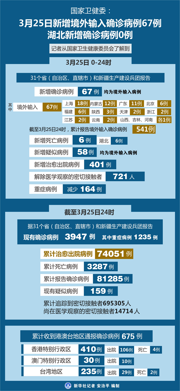 新華社北京3月26日電(記者熊豐、申鋮)記者26日從國家衛(wèi)生健康委員會了解到,3月25日0—24時,31個省(自治區(qū)、直轄市)和新疆生產(chǎn)建設(shè)兵團(tuán)報告新增確診病例67例,均為境外輸入病例;新增死亡病例6例;新增疑似病例58例,均為境外輸入病例。