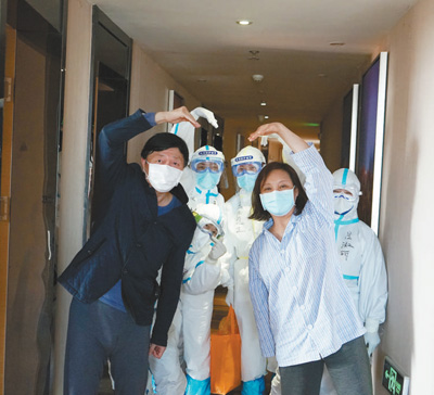 在麗楓康復(fù)驛站隔離區(qū),即將出站的康復(fù)者與醫(yī)護人員合影。本報記者 申少鐵攝