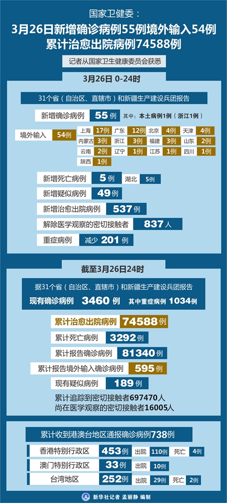 新華社北京3月27日電(記者齊中熙、張泉)記者27日從國家衛(wèi)生健康委員會(huì)獲悉,3月26日0—24時(shí),31個(gè)?。ㄗ灾螀^(qū)、直轄市)和新疆生產(chǎn)建設(shè)兵團(tuán)報(bào)告新增確診病例55例,其中境外輸入病例54例,本土病例1例(浙江1例);新增死亡病例5例(湖北5例);新增疑似病例49例。