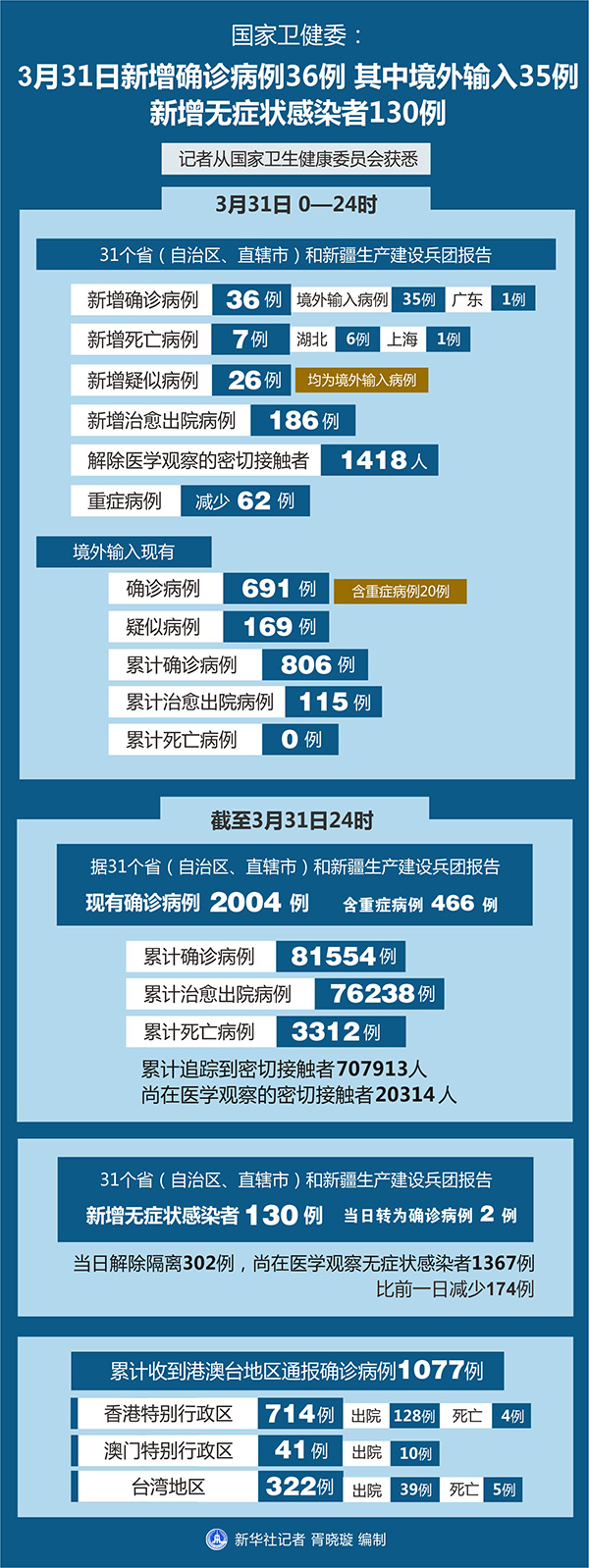截至3月31日24時(shí),據(jù)31個(gè)省(自治區(qū)、直轄市)和新疆生產(chǎn)建設(shè)兵團(tuán)報(bào)告,現(xiàn)有確診病例2004例(含重癥病例466例),現(xiàn)有疑似病例172例。累計(jì)確診病例81554例,累計(jì)治愈出院病例76238例,累計(jì)死亡病例3312例,累計(jì)追蹤到密切接觸者707913人,尚在醫(yī)學(xué)觀察的密切接觸者20314人。