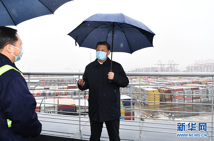 3月29日,中共中央總書(shū)記、國(guó)家主席、中央軍委主席習(xí)近平在浙江考察調(diào)研。這是習(xí)近平在寧波舟山港穿山港區(qū)碼頭了解港口復(fù)工復(fù)產(chǎn)情況。 新華社記者 申宏 攝