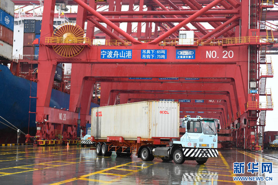 在寧波舟山港梅山島國(guó)際集裝箱碼頭,裝有集裝箱的卡車(chē)從橋吊下駛出(2019年12月19日攝)。新華社記者 黃宗治 攝