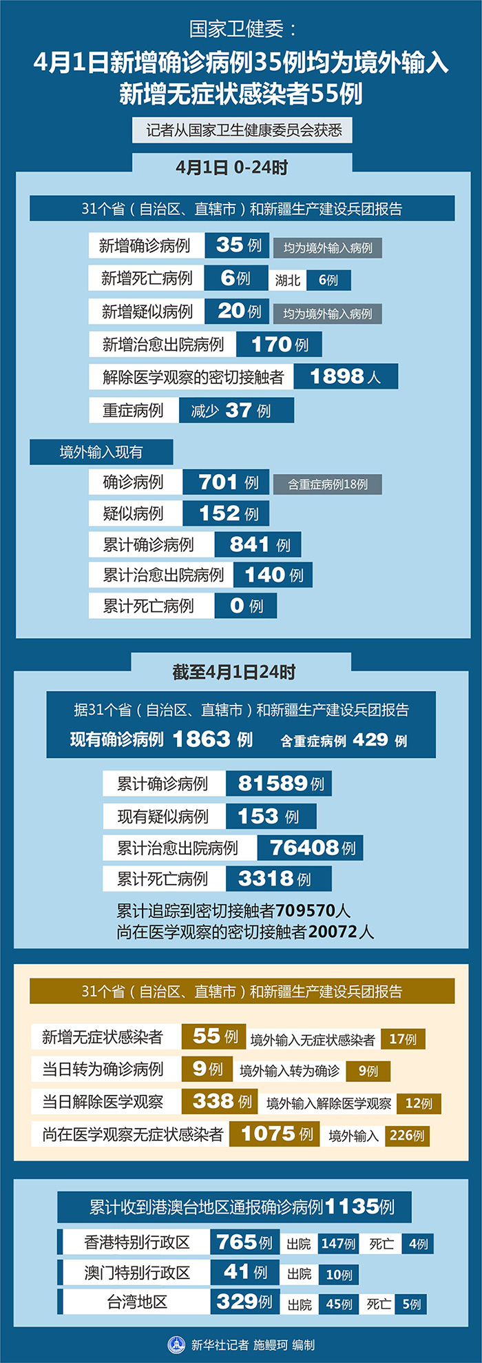 截至4月1日24時,據(jù)31個省(自治區(qū)、直轄市)和新疆生產(chǎn)建設(shè)兵團(tuán)報(bào)告,現(xiàn)有確診病例1863例(含重癥病例429例),現(xiàn)有疑似病例153例。累計(jì)確診病例81589例,累計(jì)治愈出院病例76408例,累計(jì)死亡病例3318例,累計(jì)追蹤到密切接觸者709570人,尚在醫(yī)學(xué)觀察的密切接觸者20072人。