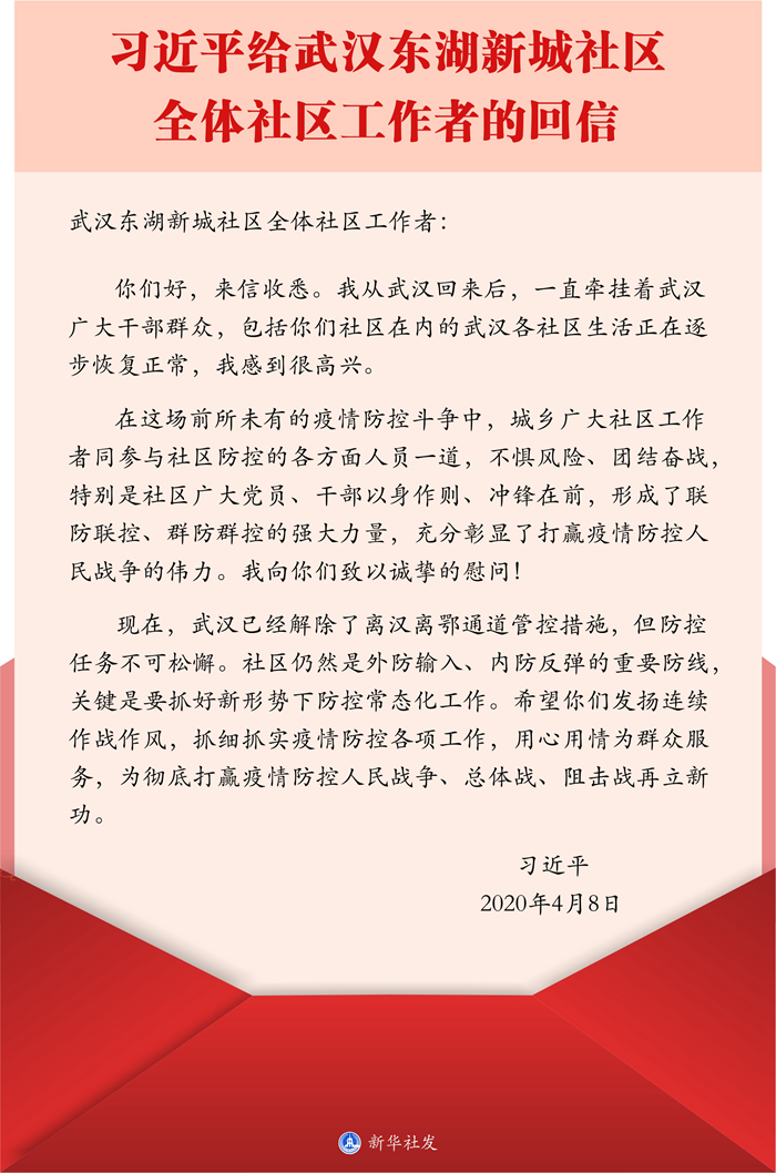 新華社北京4月9日電 中共中央總書記、國家主席、中央軍委主席習(xí)近平4月8日給武漢市東湖新城社區(qū)全體社區(qū)工作者回信,再次肯定城鄉(xiāng)廣大社區(qū)工作者在疫情防控斗爭中發(fā)揮的重要作用,向他們致以誠摯的慰問,并勉勵他們?yōu)閺氐状蜈A疫情防控人民戰(zhàn)爭、總體戰(zhàn)、阻擊戰(zhàn)再立新功。