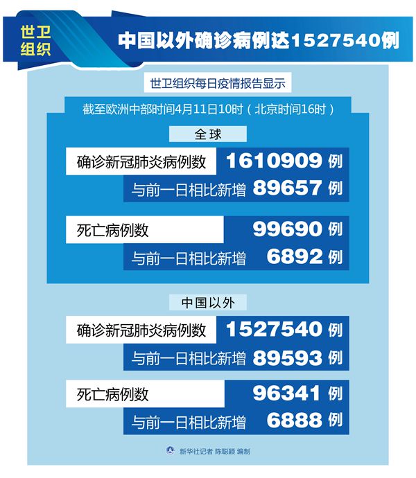 世衛(wèi)組織每日疫情報(bào)告顯示,截至歐洲中部時(shí)間11日10時(shí)(北京時(shí)間16時(shí)),中國以外新冠確診病例較前一日增加89593例,達(dá)到1527540例;中國以外死亡病例較前一日增加6888例,達(dá)到96341例。