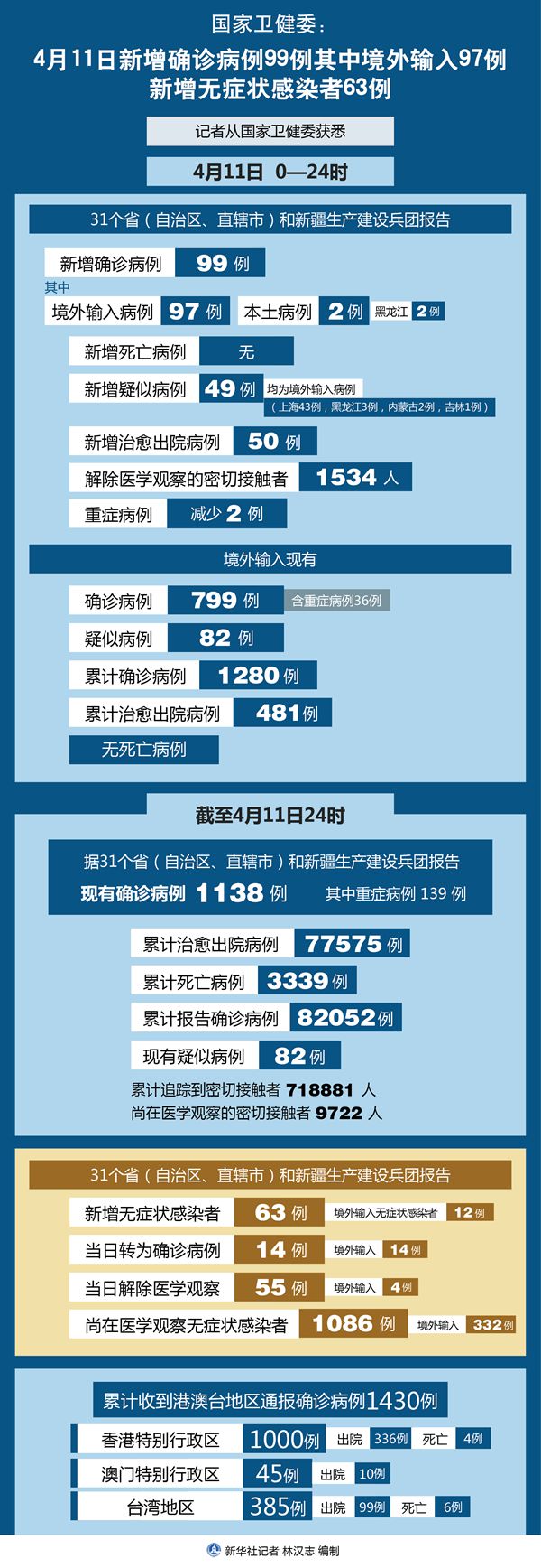 截至4月11日24時(shí),據(jù)31個(gè)?。ㄗ灾螀^(qū)、直轄市)和新疆生產(chǎn)建設(shè)兵團(tuán)報(bào)告,現(xiàn)有確診病例1138例(其中重癥病例139例),累計(jì)治愈出院病例77575例,累計(jì)死亡病例3339例,累計(jì)報(bào)告確診病例82052例,現(xiàn)有疑似病例82例。累計(jì)追蹤到密切接觸者718881人,尚在醫(yī)學(xué)觀察的密切接觸者9722人。