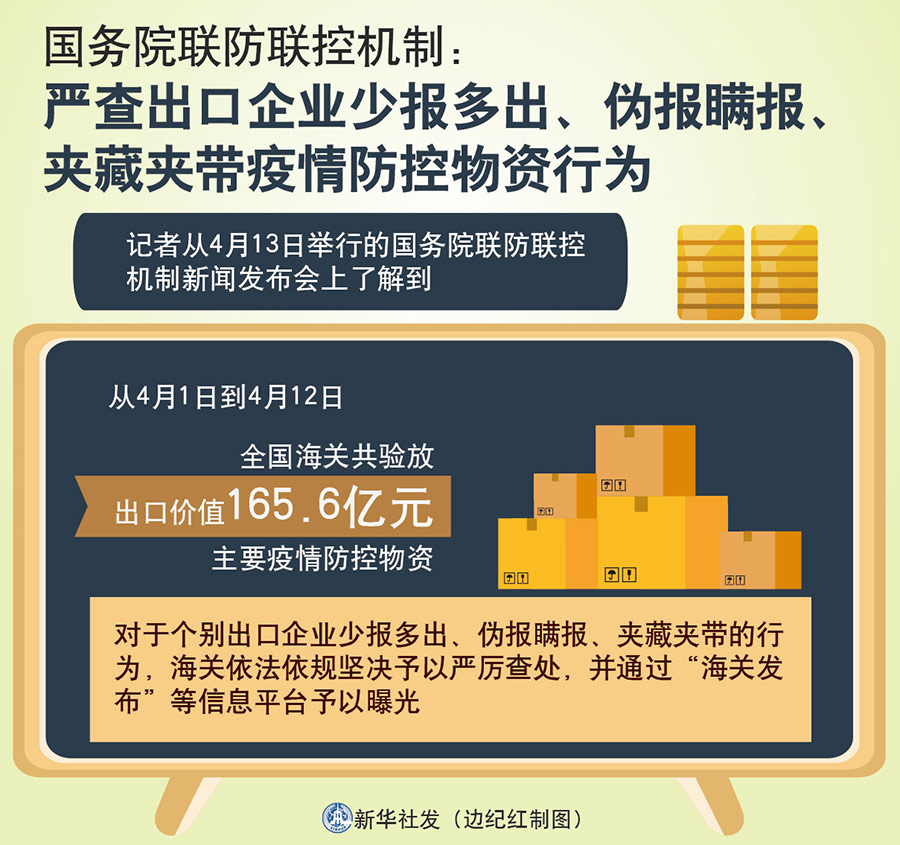 新華社北京4月13日電(記者屈婷、王鵬)記者從13日舉行的國(guó)務(wù)院聯(lián)防聯(lián)控機(jī)制新聞發(fā)布會(huì)上了解到,從4月1日到4月12日,全國(guó)海關(guān)共驗(yàn)放出口價(jià)值165.6億元的主要疫情防控物資,對(duì)個(gè)別出口企業(yè)少報(bào)多出、偽報(bào)瞞報(bào)、夾藏夾帶的行為,依法依規(guī)予以嚴(yán)厲查處。
