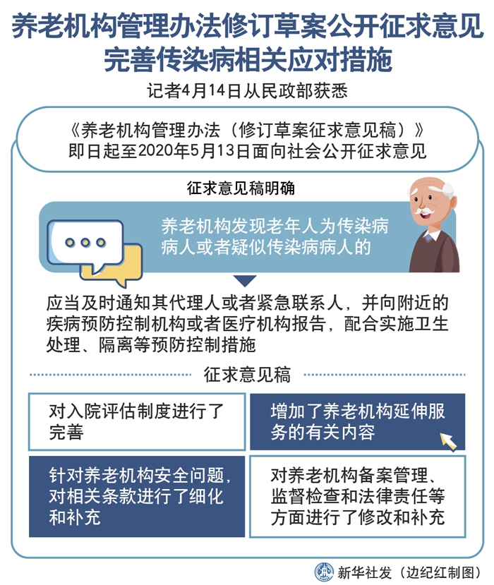 新華社北京4月14日電(記者孫少龍)記者14日從民政部獲悉,《養(yǎng)老機構(gòu)管理辦法(修訂草案征求意見稿)》即日起至2020年5月13日面向社會公開征求意見,結(jié)合新冠肺炎疫情防控要求,征求意見稿依法完善了養(yǎng)老機構(gòu)發(fā)現(xiàn)老年人為傳染病病人或者疑似傳染病病人時的應(yīng)對措施。