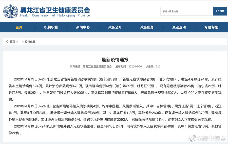 2020年4月19日0-24時(shí),黑龍江省省內(nèi)新增確診病例3例(哈爾濱3例),新增無(wú)癥狀感染者3例(哈爾濱3例)。截至4月19日24時(shí),累計(jì)報(bào)告本土確診病例524例,累計(jì)治愈出院病例470例,現(xiàn)有確診病例41例(哈爾濱39例、牡丹江2例),現(xiàn)有無(wú)癥狀感染者26例(哈爾濱21例、牡丹江3例、綏化2例)。當(dāng)日發(fā)熱門診診療人數(shù)1095人。累計(jì)追蹤到密切接觸者17599人,已解除醫(yī)學(xué)觀察16507人,尚有1092人正在接受醫(yī)學(xué)觀察。