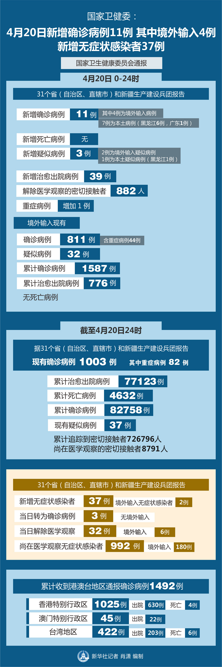 截至4月20日24時,據(jù)31個?。ㄗ灾螀^(qū)、直轄市)和新疆生產(chǎn)建設(shè)兵團報告,現(xiàn)有確診病例1003例(其中重癥病例82例),累計治愈出院病例77123例,累計死亡病例4632例,累計報告確診病例82758例,現(xiàn)有疑似病例37例。累計追蹤到密切接觸者726797人,尚在醫(yī)學(xué)觀察的密切接觸者8791人。