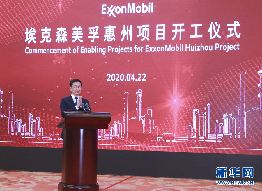 4月22日,埃克森美孚在粵港澳大灣區(qū)投資建設的廣東惠州乙烯項目舉行“云開工”儀式。中共中央政治局常委、國務院副總理韓正出席并宣布項目開工。 新華社記者 丁林 攝