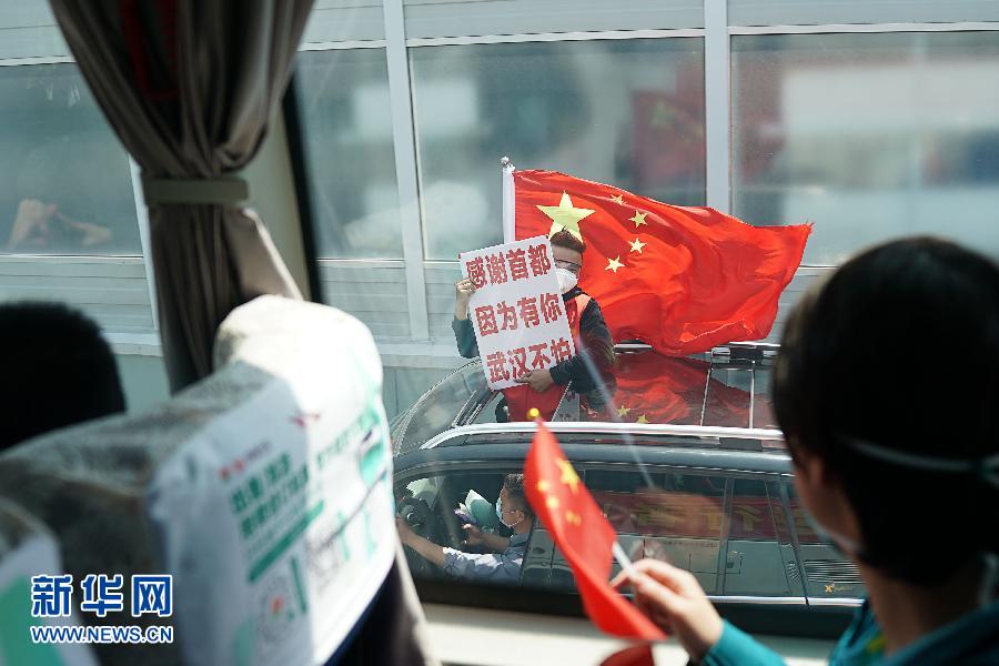 歡送的人群舉著橫幅——“感謝北京,因?yàn)橛心悖錆h不怕”“致敬最美逆行者”等標(biāo)語在陽光下閃動(dòng)。