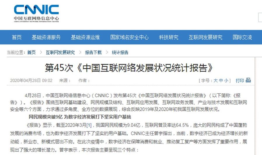 4月28日,中國互聯(lián)網(wǎng)絡(luò)信息中心(CNNIC)發(fā)布第45次《中國互聯(lián)網(wǎng)絡(luò)發(fā)展?fàn)顩r統(tǒng)計(jì)報(bào)告》(以下簡稱:《報(bào)告》)?!秷?bào)告》圍繞互聯(lián)網(wǎng)基礎(chǔ)建設(shè)、網(wǎng)民規(guī)模及結(jié)構(gòu)、互聯(lián)網(wǎng)應(yīng)用發(fā)展、互聯(lián)網(wǎng)政務(wù)發(fā)展、產(chǎn)業(yè)與技術(shù)發(fā)展和互聯(lián)網(wǎng)安全等六個(gè)方面,力求通過多角度、全方位的數(shù)據(jù)展現(xiàn),綜合反映2019年及2020年初我國互聯(lián)網(wǎng)發(fā)展?fàn)顩r。