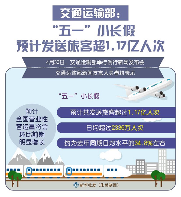 新華社北京4月30日電(記者樊曦、魏玉坤)30日,交通運輸部舉行例行新聞發(fā)布會。交通運輸部新聞發(fā)言人吳春耕表示,“五一”小長假,預計全國營業(yè)性客運量將會環(huán)比前期明顯增長,預計共發(fā)送旅客超過1.17億人次。