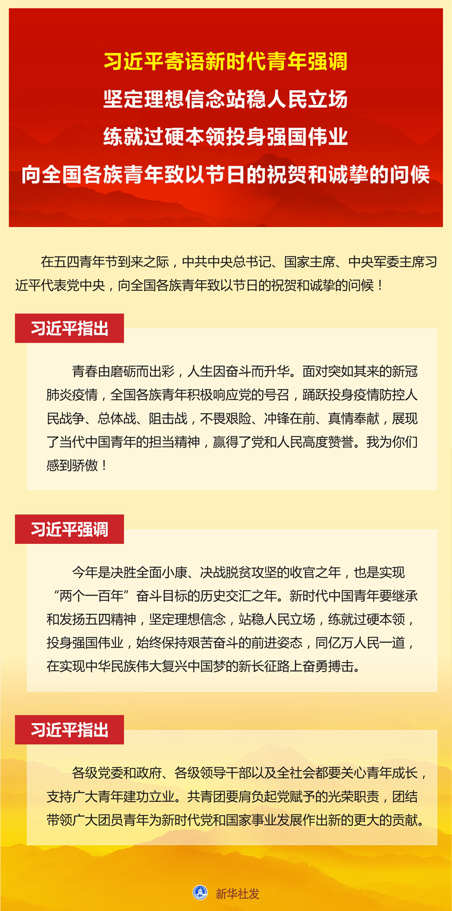 新華社北京5月3日電 在五四青年節(jié)到來之際,中共中央總書記、國家主席、中央軍委主席習近平代表黨中央,向全國各族青年致以節(jié)日的祝賀和誠摯的問候!