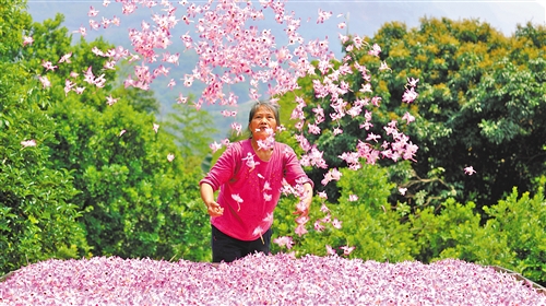 5月5日,在貴州省赤水市長沙鎮(zhèn)長興村,農(nóng)戶在晾曬剛采摘的金釵石斛鮮花。近年來,赤水市積極推進(jìn)生態(tài)農(nóng)業(yè)與鄉(xiāng)村旅游產(chǎn)業(yè)融合發(fā)展,引導(dǎo)農(nóng)民在丹霞石上種植金釵石斛9萬余畝,助力脫貧攻堅和鄉(xiāng)村振興。王長育攝(中經(jīng)視覺)