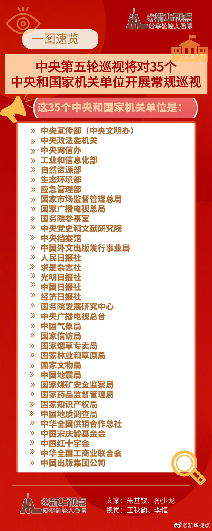 新華社北京5月9日電 經(jīng)黨中央批準(zhǔn),十九屆中央第五輪巡視將對(duì)中央宣傳部(中央文明辦)、中央政法委機(jī)關(guān)、中央網(wǎng)信辦、工業(yè)和信息化部、自然資源部、生態(tài)環(huán)境部、應(yīng)急管理部、國(guó)家市場(chǎng)監(jiān)督管理總局、國(guó)家廣播電視總局、國(guó)務(wù)院參事室、中央黨史和文獻(xiàn)研究院、中央檔案館、中國(guó)外文出版發(fā)行事業(yè)局、人民日?qǐng)?bào)社、求是雜志社、光明日?qǐng)?bào)社、中國(guó)日?qǐng)?bào)社、經(jīng)濟(jì)日?qǐng)?bào)社、國(guó)務(wù)院發(fā)展研究中心、中央廣播電視總臺(tái)、中國(guó)氣象局、國(guó)家信訪局、國(guó)家煙草專賣局、國(guó)家林業(yè)和草原局、國(guó)家文物局、中國(guó)地震局、國(guó)家煤礦安全監(jiān)察局、國(guó)家藥品監(jiān)督管理局、國(guó)家知識(shí)產(chǎn)權(quán)局、中國(guó)地質(zhì)調(diào)查局、中華全國(guó)供銷合作總社、中國(guó)宋慶齡基金會(huì)、中國(guó)紅十字會(huì)、中華全國(guó)工商業(yè)聯(lián)合會(huì)、中國(guó)出版集團(tuán)公司等35個(gè)中央和國(guó)家機(jī)關(guān)單位黨組織開(kāi)展常規(guī)巡視。