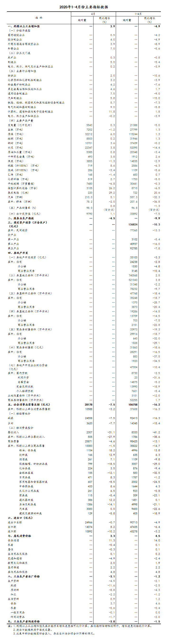 4月份,全國規(guī)模以上工業(yè)增加值同比增長3.9%,3月份為下降1.1%;環(huán)比增長2.27%。1-4月份,全國規(guī)模以上工業(yè)增加值同比下降4.9%,降幅比1-3月份收窄3.5個百分點。4月份,分經(jīng)濟類型看,國有控股企業(yè)增加值增長0.5%;股份制企業(yè)增長4.0%,外商及港澳臺商投資企業(yè)增長3.9%;私營企業(yè)增長7.0%。分三大門類看,采礦業(yè)增加值增長0.3%;制造業(yè)增長5.0%,3月份為下降1.8%;電力、熱力、燃氣及水生產(chǎn)和供應(yīng)業(yè)增長0.2%。高技術(shù)制造業(yè)和裝備制造業(yè)增長較快。4月份,高技術(shù)制造業(yè)和裝備制造業(yè)增加值分別增長10.5%和9.3%,快于規(guī)模以上工業(yè)6.6和5.4個百分點。從產(chǎn)品產(chǎn)量看,光纜,挖掘、鏟土運輸機械,集成電路,工業(yè)機器人,微型計算機設(shè)備產(chǎn)量同比分別增長43.8%、40.8%、29.2%、26.6%、26.2%。