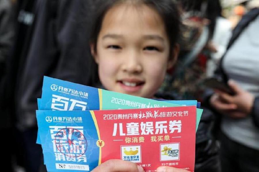 一名兒童在貴州丹寨萬達小鎮(zhèn)展示領取到的旅游消費券 歐東衢 攝