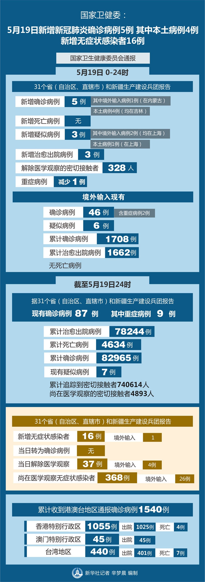 截至5月19日24時,據(jù)31個?。ㄗ灾螀^(qū)、直轄市)和新疆生產(chǎn)建設兵團報告,現(xiàn)有確診病例87例(其中重癥病例9例),累計治愈出院病例78244例,累計死亡病例4634例,累計報告確診病例82965例,現(xiàn)有疑似病例7例。累計追蹤到密切接觸者740614人,尚在醫(yī)學觀察的密切接觸者4893人。
