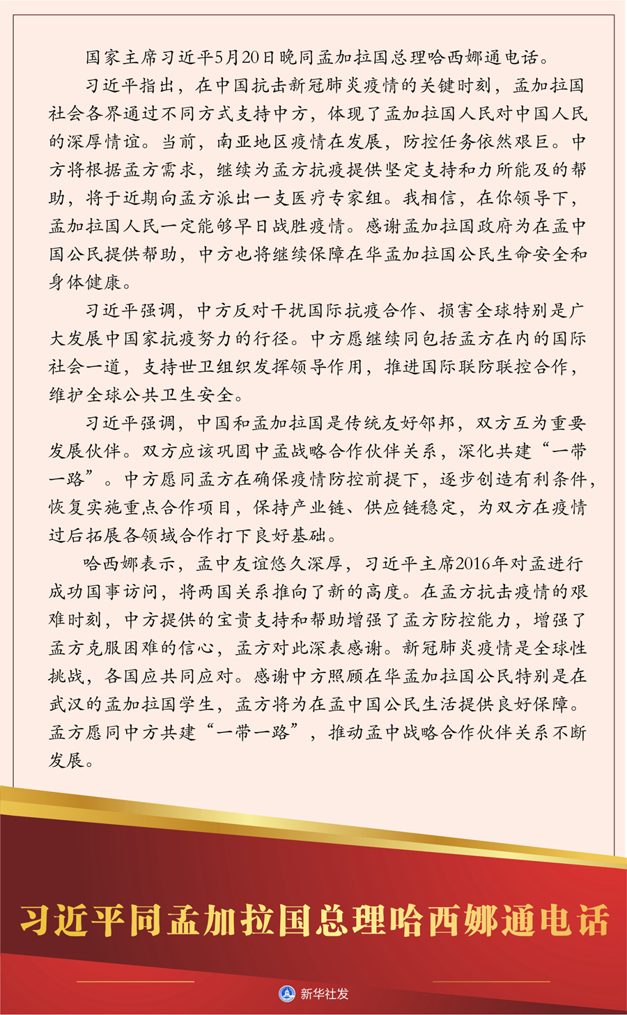 習(xí)近平指出,在中國抗擊新冠肺炎疫情的關(guān)鍵時刻,孟加拉國社會各界通過不同方式支持中方,體現(xiàn)了孟加拉國人民對中國人民的深厚情誼。當(dāng)前,南亞地區(qū)疫情在發(fā)展,防控任務(wù)依然艱巨。中方將根據(jù)孟方需求,繼續(xù)為孟方抗疫提供堅定支持和力所能及的幫助,將于近期向孟方派出一支醫(yī)療專家組。我相信,在你領(lǐng)導(dǎo)下,孟加拉國人民一定能夠早日戰(zhàn)勝疫情。感謝孟加拉國政府為在孟中國公民提供幫助,中方也將繼續(xù)保障在華孟加拉國公民生命安全和身體健康。