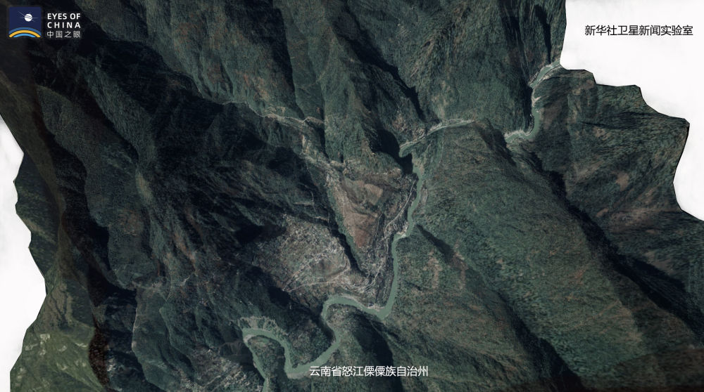 ↑從衛(wèi)星可以看到,綠樹(shù)環(huán)繞的托坪村新址位于在怒江邊上。