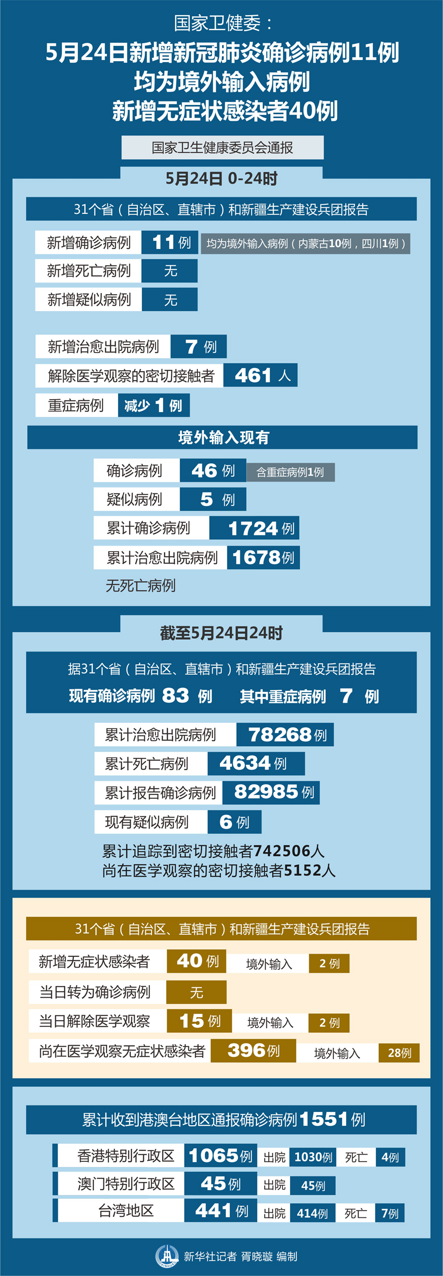 截至5月24日24時,據(jù)31個?。ㄗ灾螀^(qū)、直轄市)和新疆生產(chǎn)建設兵團報告,現(xiàn)有確診病例83例(其中重癥病例7例),累計治愈出院病例78268例,累計死亡病例4634例,累計報告確診病例82985例,現(xiàn)有疑似病例6例。累計追蹤到密切接觸者742506人,尚在醫(yī)學觀察的密切接觸者5152人。