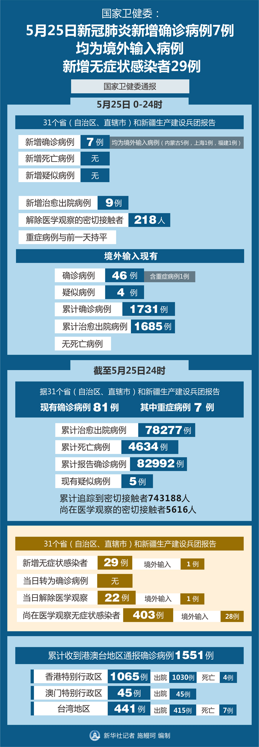新華社北京5月26日電(記者王秉陽)國家衛(wèi)健委26日通報,5月25日0—24時,31個?。ㄗ灾螀^(qū)、直轄市)和新疆生產(chǎn)建設(shè)兵團(tuán)報告新增確診病例7例,均為境外輸入病例(內(nèi)蒙古5例,上海1例,福建1例);無新增死亡病例;無新增疑似病例。