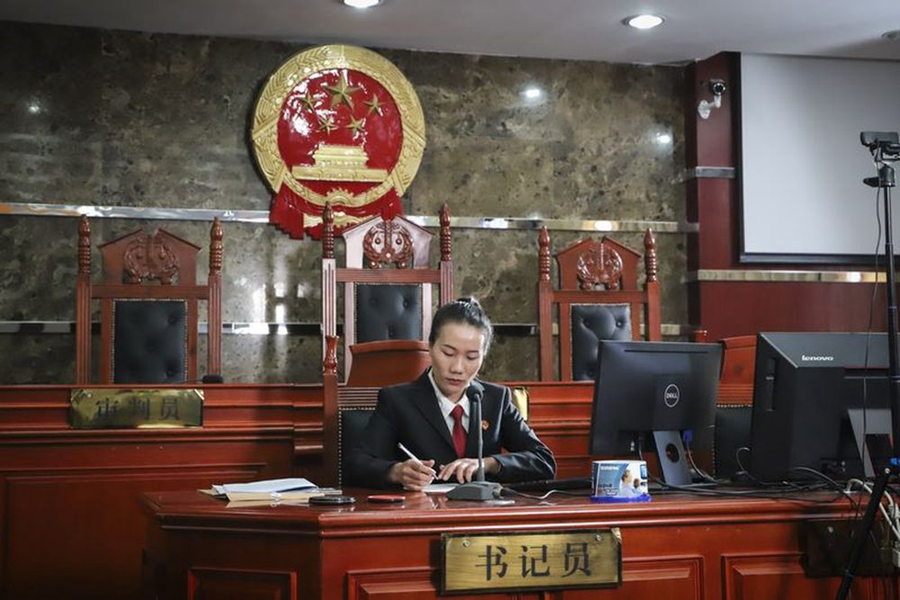 ↑李金蓮在迪慶州中級(jí)人民法院法庭上準(zhǔn)備開庭工作(5月7日攝)。新華社發(fā)(肖竹尹攝)