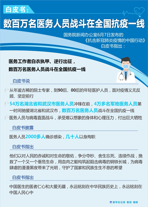 新華社北京6月7日電(記者田曉航)國(guó)務(wù)院新聞辦公室7日發(fā)布的《抗擊新冠肺炎疫情的中國(guó)行動(dòng)》白皮書(shū)指出,醫(yī)務(wù)工作者白衣執(zhí)甲、逆行出征,數(shù)百萬(wàn)名醫(yī)務(wù)人員戰(zhàn)斗在全國(guó)抗疫一線。