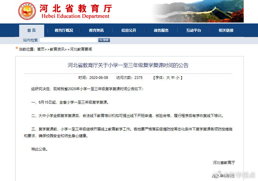 記者9日從河北省教育廳獲悉,河北省6月15日起全省小學(xué)一至三年級復(fù)學(xué)復(fù)課。復(fù)學(xué)復(fù)課前,小學(xué)一至三年級繼續(xù)開展線上教育教學(xué)工作。河北省教育廳要求各地要嚴(yán)格落實疫情防控常態(tài)化條件下復(fù)學(xué)復(fù)課各項防控措施和要求,確保校園安全和師生身心健康。大中小學(xué)全部復(fù)學(xué)復(fù)課后,合法線下教育培訓(xùn)機(jī)構(gòu)可提出線下開班申請,核驗合格,履行程序后有序恢復(fù)線下培訓(xùn)。(記者李繼偉)