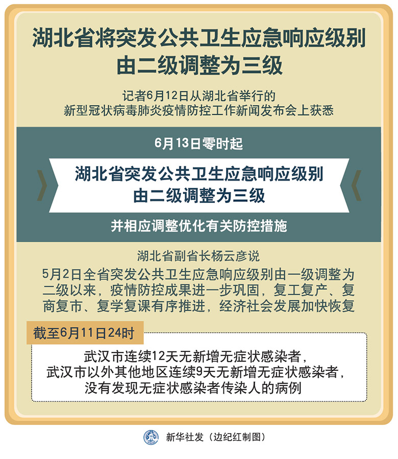 新華社武漢6月12日電(記者李偉、樂(lè)文婉)記者12日從湖北省舉行的新型冠狀病毒肺炎疫情防控工作新聞發(fā)布會(huì)上獲悉,6月13日零時(shí)起,湖北省突發(fā)公共衛(wèi)生應(yīng)急響應(yīng)級(jí)別由二級(jí)調(diào)整為三級(jí),并相應(yīng)調(diào)整優(yōu)化有關(guān)防控措施。