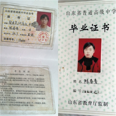 5月26日,山東理工大學招生處工作人員向陳春秀證實,她的學籍被同縣考生陳雙雙頂替使用。