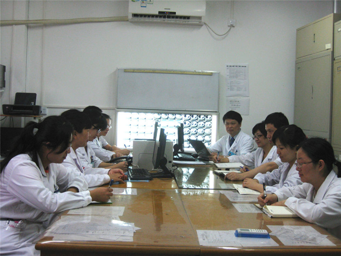 中國醫(yī)學(xué)科學(xué)院腫瘤醫(yī)院徐兵河教授(右五)、馬飛教授(右三)帶領(lǐng)科室共同討論乳腺癌診療中的疑難病例。(圖片由受訪者提供)